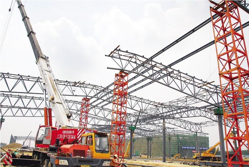 7月2日,施工人員正加緊吊裝京滬高鐵蚌埠站站臺(tái)鋼架結(jié)構(gòu)雨棚。作為京滬高鐵全段較大的客站蚌埠站站房工程,目前建設(shè)速度不斷加快,預(yù)計(jì)今年9月前站房全部竣工、交付使用。按照列車運(yùn)行規(guī)劃,2015年停靠列車40對(duì),2020年??苛熊?3對(duì)。記者 郭雷 通訊員竇凱 攝
