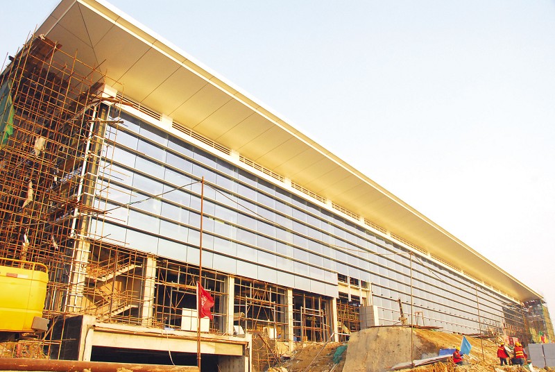 目前,高鐵站站房主體結(jié)構(gòu)已經(jīng)竣工,工人們正在進(jìn)行幕墻玻璃吊裝,玻璃呈淺藍(lán)色,每塊長(zhǎng)約2.5米,寬約2米,現(xiàn)已吊裝了約一半的面積。站房?jī)?nèi),工人們正在做室內(nèi)裝修,墻面和承重柱主要采用了灰白相間的花崗巖鋪裝,頂部和地面尚未開始裝潢。據(jù)了解,站房?jī)?nèi)外裝修將在4月底進(jìn)入尾聲,并于5月底基本完成。