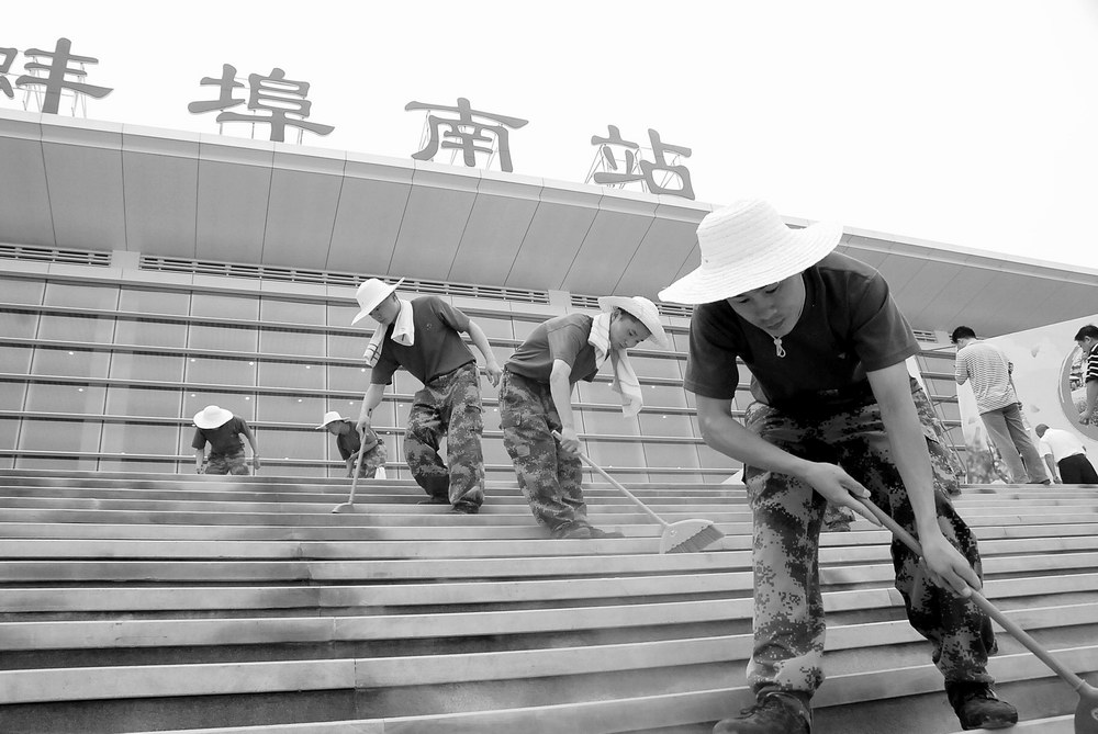 6月28日上午,解放軍汽車管理學(xué)院組織200余名官兵清掃高鐵蚌埠南站站前廣場,為第二故鄉(xiāng)建設(shè)做貢獻。