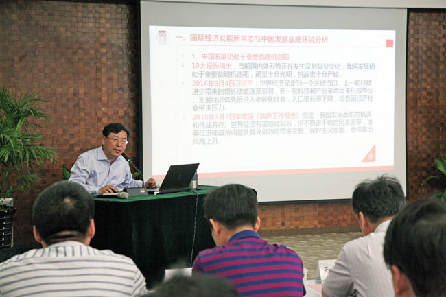 上午,陳教授做了“十九大后中國經(jīng)濟發(fā)展趨勢分析”的專題報告,結(jié)合十九大后國內(nèi)外經(jīng)濟發(fā)展新形勢,在對國際經(jīng)濟發(fā)展新常態(tài)與中國發(fā)展戰(zhàn)略環(huán)境內(nèi)在聯(lián)系研究基礎(chǔ)上,深入分析了十九大后國內(nèi)經(jīng)濟發(fā)展走勢與改革走向。下午,陳教授做了“國資國企改革的難點熱點分析”的專題報告,結(jié)合近幾年國資國企改革政策及國內(nèi)國企整體發(fā)展現(xiàn)狀,提出學習貫徹十九大精神,進一步加快國資國企改革的必要性,在此基礎(chǔ)上,深入介紹了深化國資國企改革的具體內(nèi)容與發(fā)展趨勢。